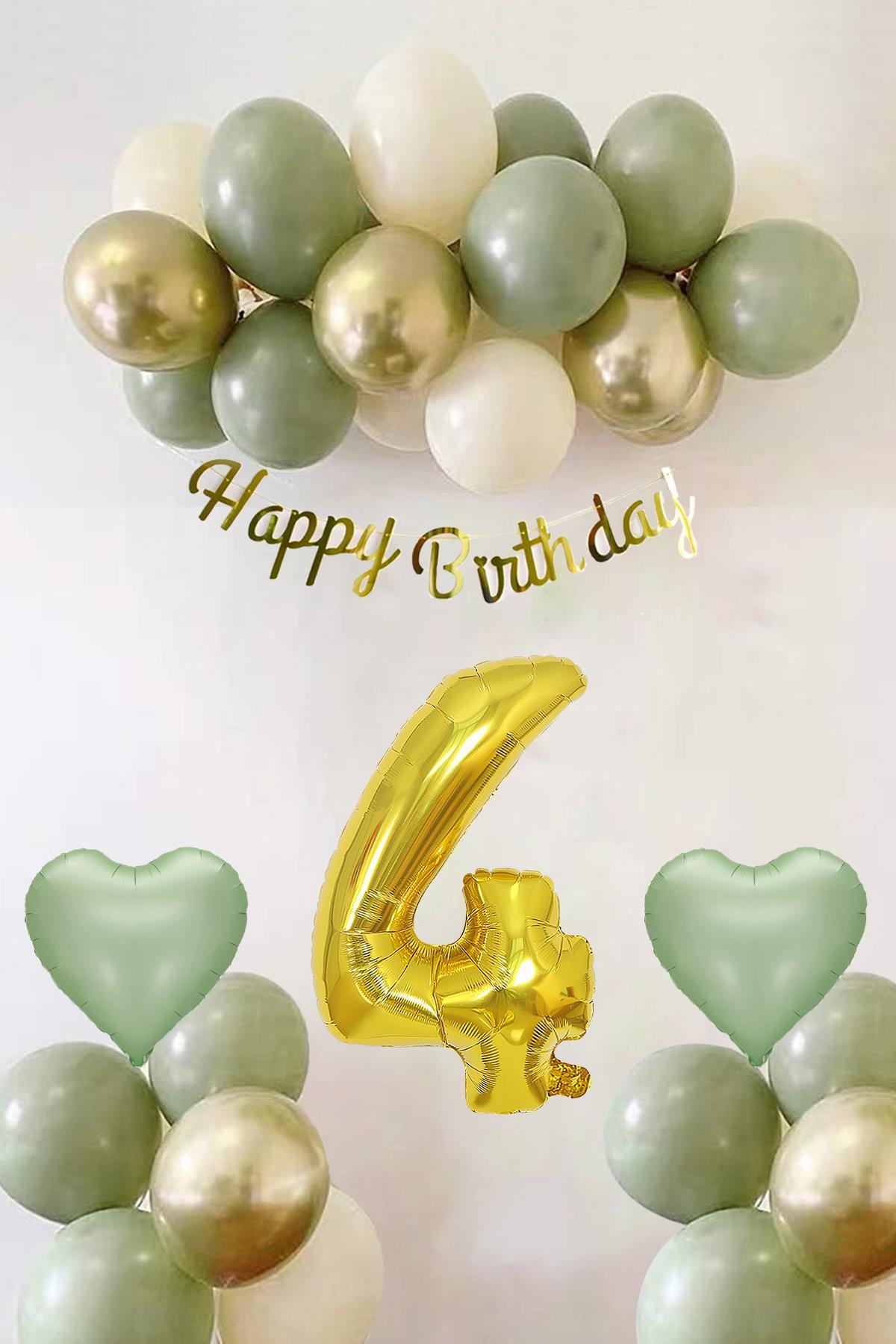 4 Yaş Doğum Günü Seti ; Küf Yeşili-Krom Gold- Deniz Kumu ve Adaçayı Kalp Folyo Balon Set