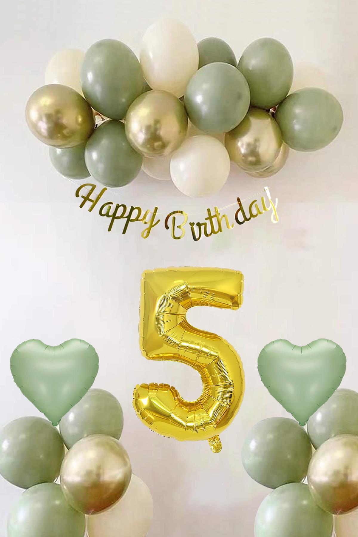 5 Yaş Doğum Günü Seti ; Küf Yeşili-Krom Gold- Deniz Kumu ve Adaçayı Kalp Folyo Balon Set
