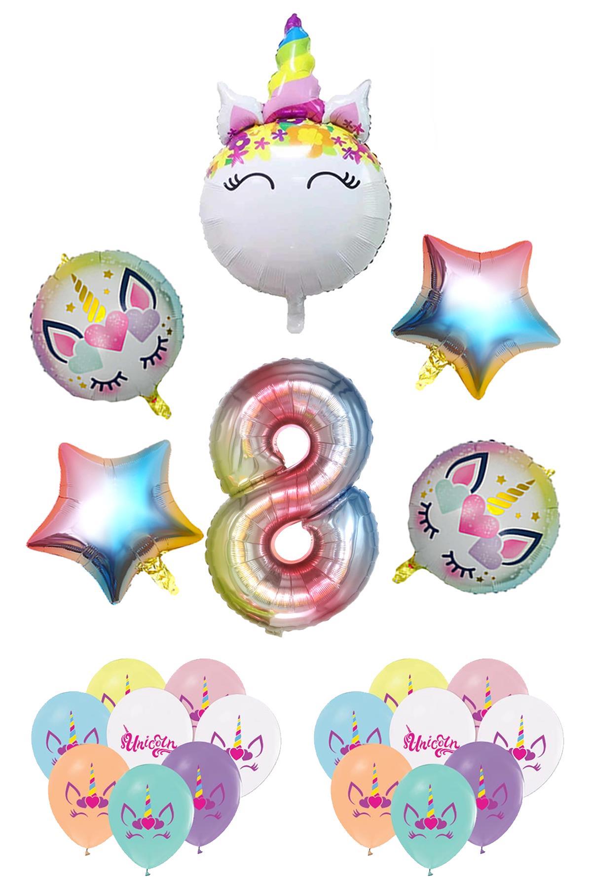 8 Yaş Gökkuşağı Konsepti Unicorn Temalı Doğum Günü Parti Kutlama Seti