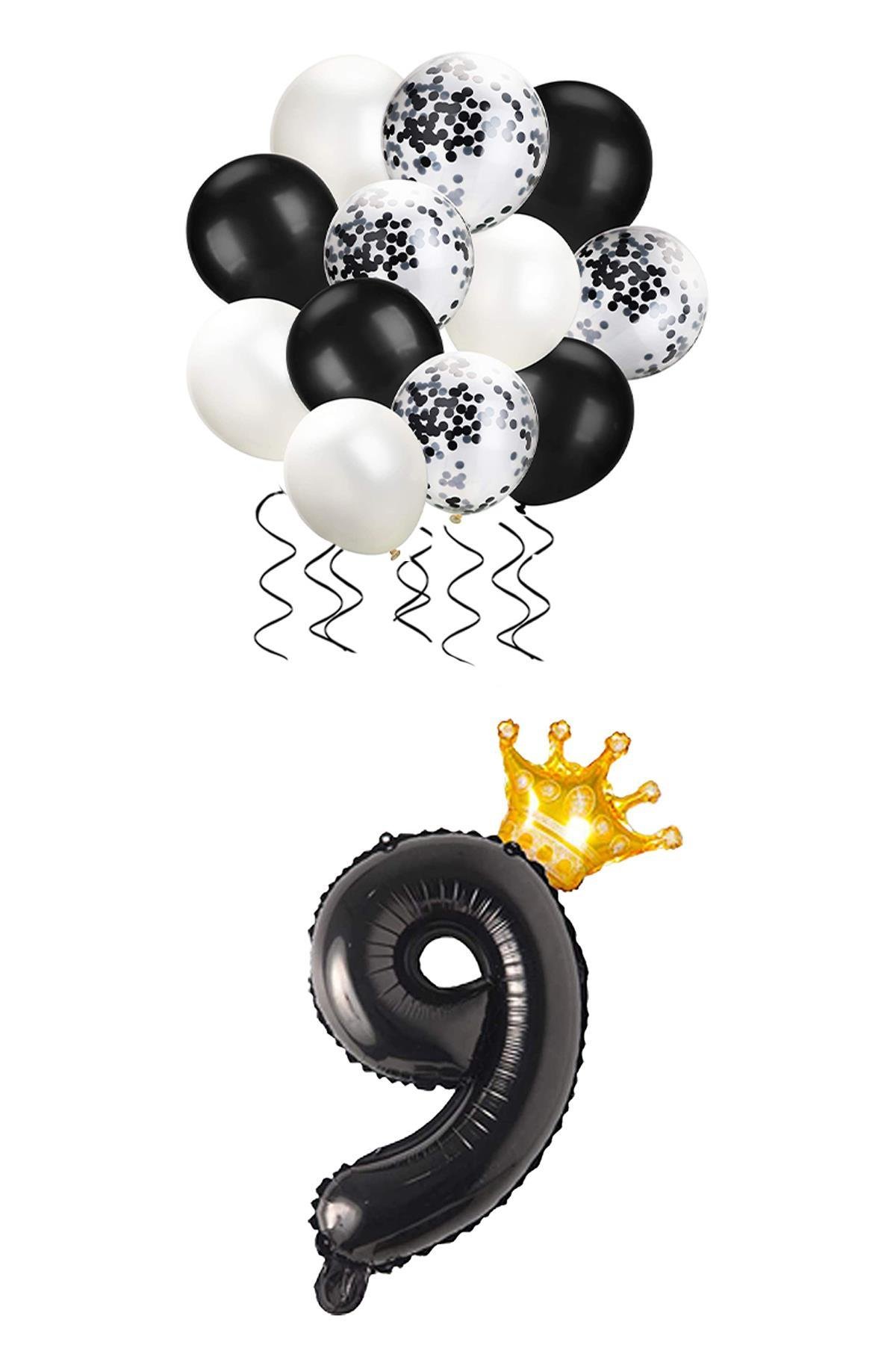 9 Rakam Siyah Folyo Balon, Kral Tacı Ve Konfetili Siyah Balon Set