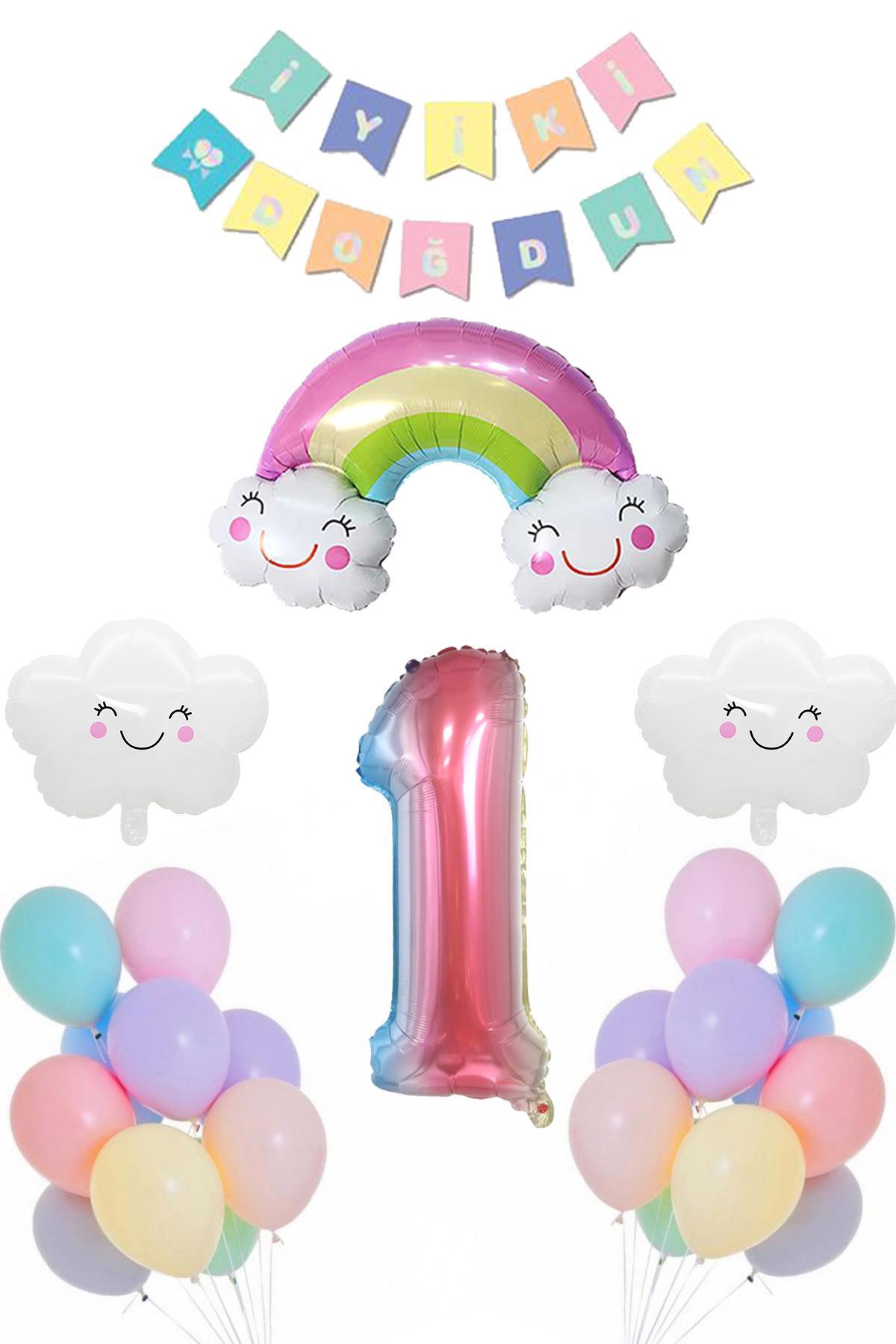 Gökkuşağı Bulut Temalı 1 Yaş Doğum Günü Parti Kutlama Seti