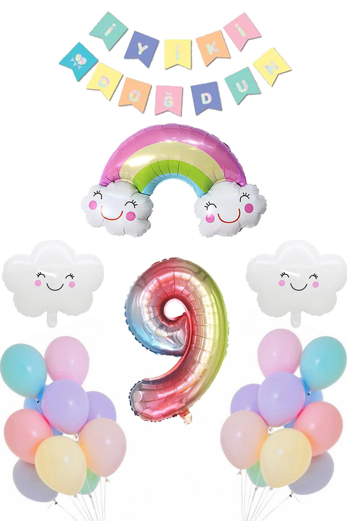 Gökkuşağı Bulut Temalı 9 Yaş Doğum Günü Parti Kutlama Seti