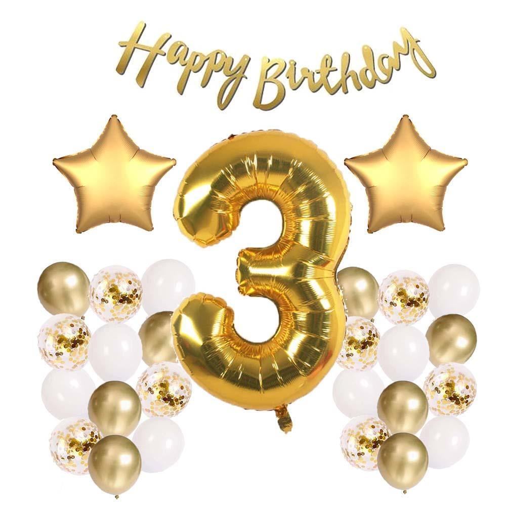 Gold Konsept 3 Yaş Doğum Günü Parti Kutlama Seti; Beyaz Gold ve Konfetili Balon, Rakam ve Yıldız Folyo Balon ve Kaligrafi Happy Birthday Gold Banner