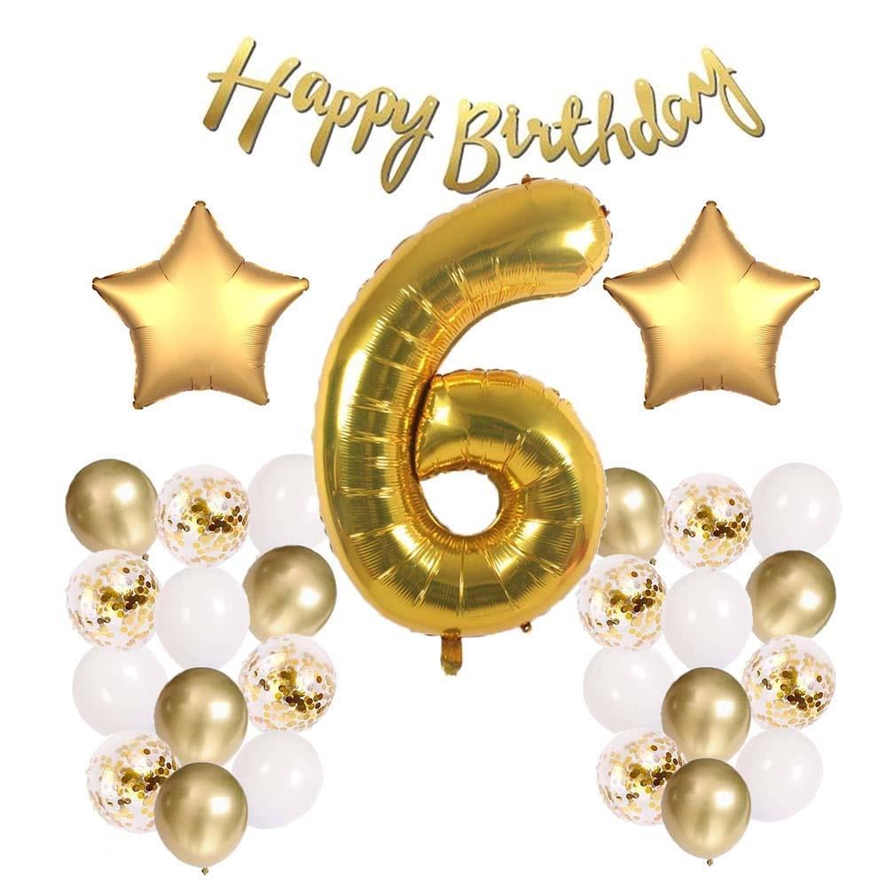 Gold Konsept 6 Yaş Doğum Günü Parti Kutlama Seti; Beyaz Gold ve Konfetili Balon, Rakam ve Yıldız Folyo Balon ve Kaligrafi Happy Birthday Gold Banner