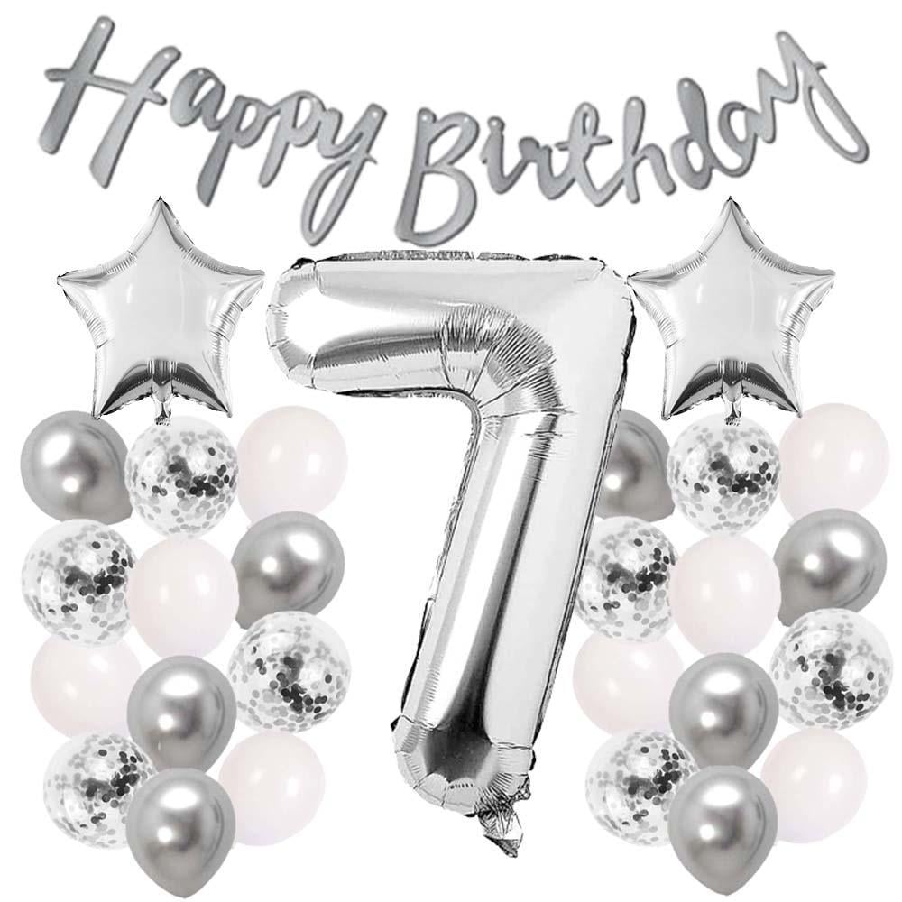 Gümüş Konsept 7 Yaş Doğum Günü Parti Kutlama Seti; Beyaz Gümüş ve Konfetili Balon, Rakam ve Yıldız Folyo Balon ve Kaligrafi Happy Birthday Gümüş Banner
