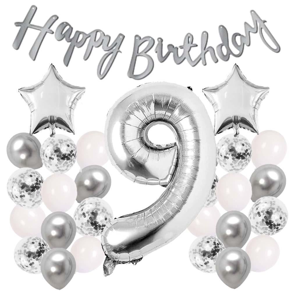 Gümüş Konsept 9 Yaş Doğum Günü Parti Kutlama Seti; Beyaz Gümüş ve Konfetili Balon, Rakam ve Yıldız Folyo Balon ve Kaligrafi Happy Birthday Gümüş Banner