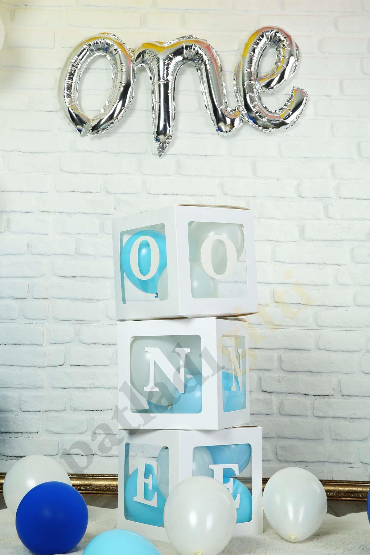 One Yazılı Beyaz Kutu ve Mavi-Beyaz Balon Seti Erkek Bebek İçin Doğum Günü Kutlama Parti Seti