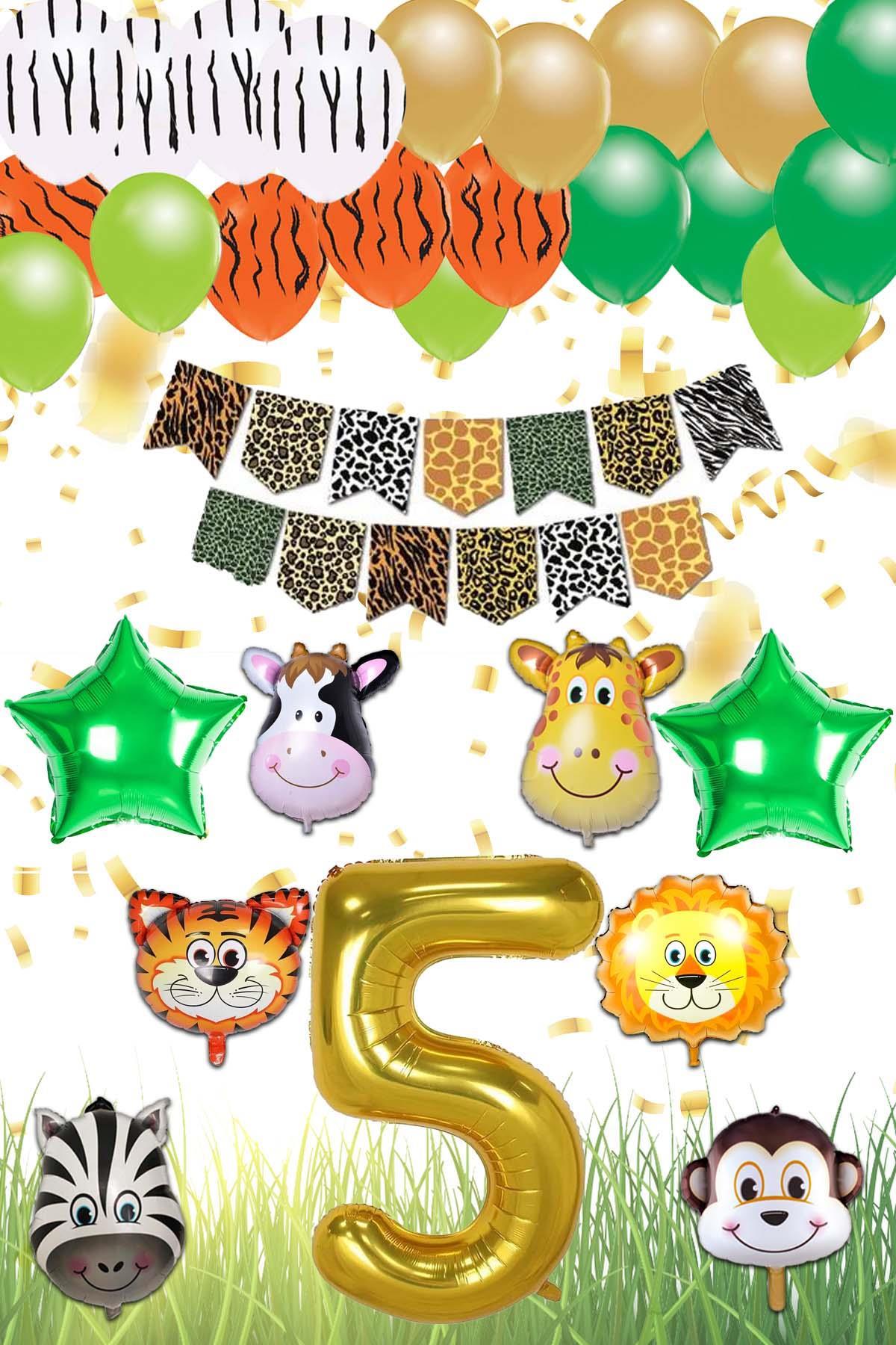 Safari Konsepti 5 Yaş Doğum Günü Parti Kutlama Seti; Rakam ve Yıldız Folyo, Banner ve Balon Zinciri