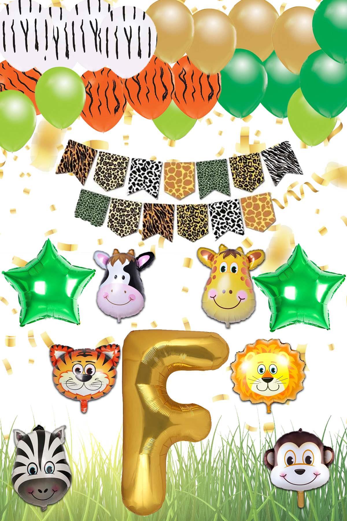 Safari Konsepti F Harfli Doğum Günü Parti Kutlama Seti; Harf ve Yıldız Folyo, Banner ve Balon Zinciri