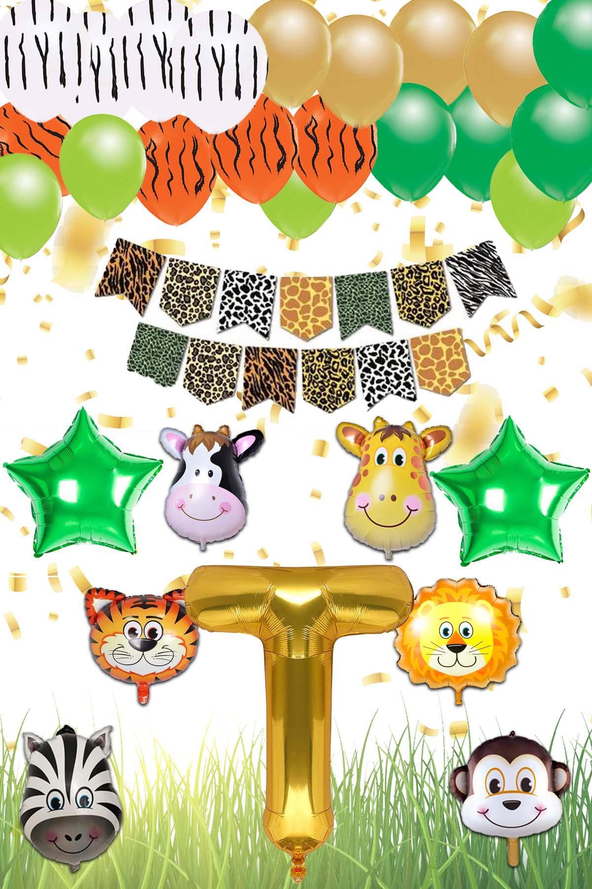 Safari Konsepti T Harfli Doğum Günü Parti Kutlama Seti; Harf ve Yıldız Folyo, Banner ve Balon Zinciri