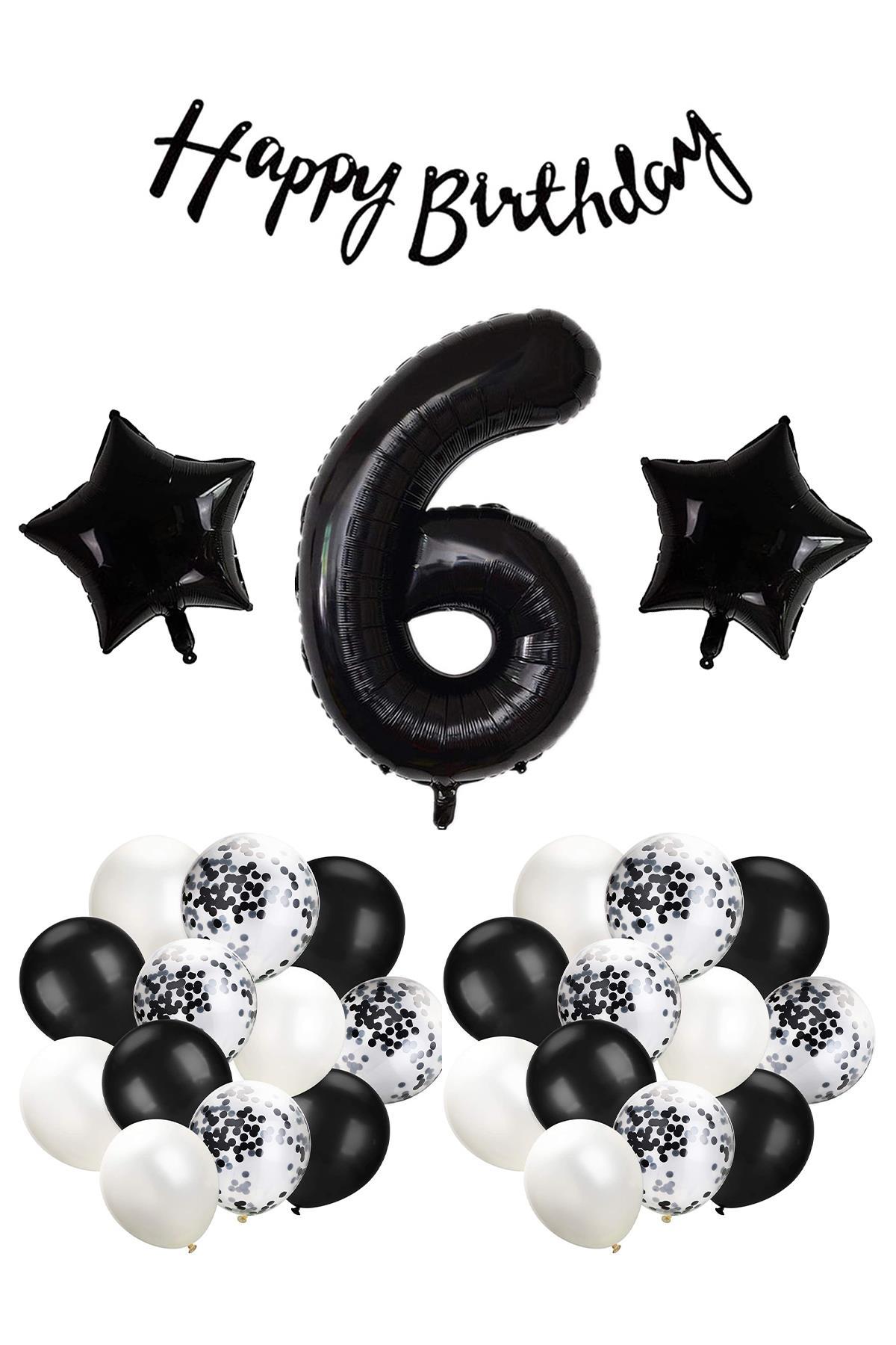 Siyah Konsept 6 Yaş Doğum Günü Parti Kutlama Seti; Beyaz Siyah ve Siyah Konfetili Balon, Rakam ve Yıldız Folyo Balon ve Kaligrafi Happy Birthday Siyah Banner