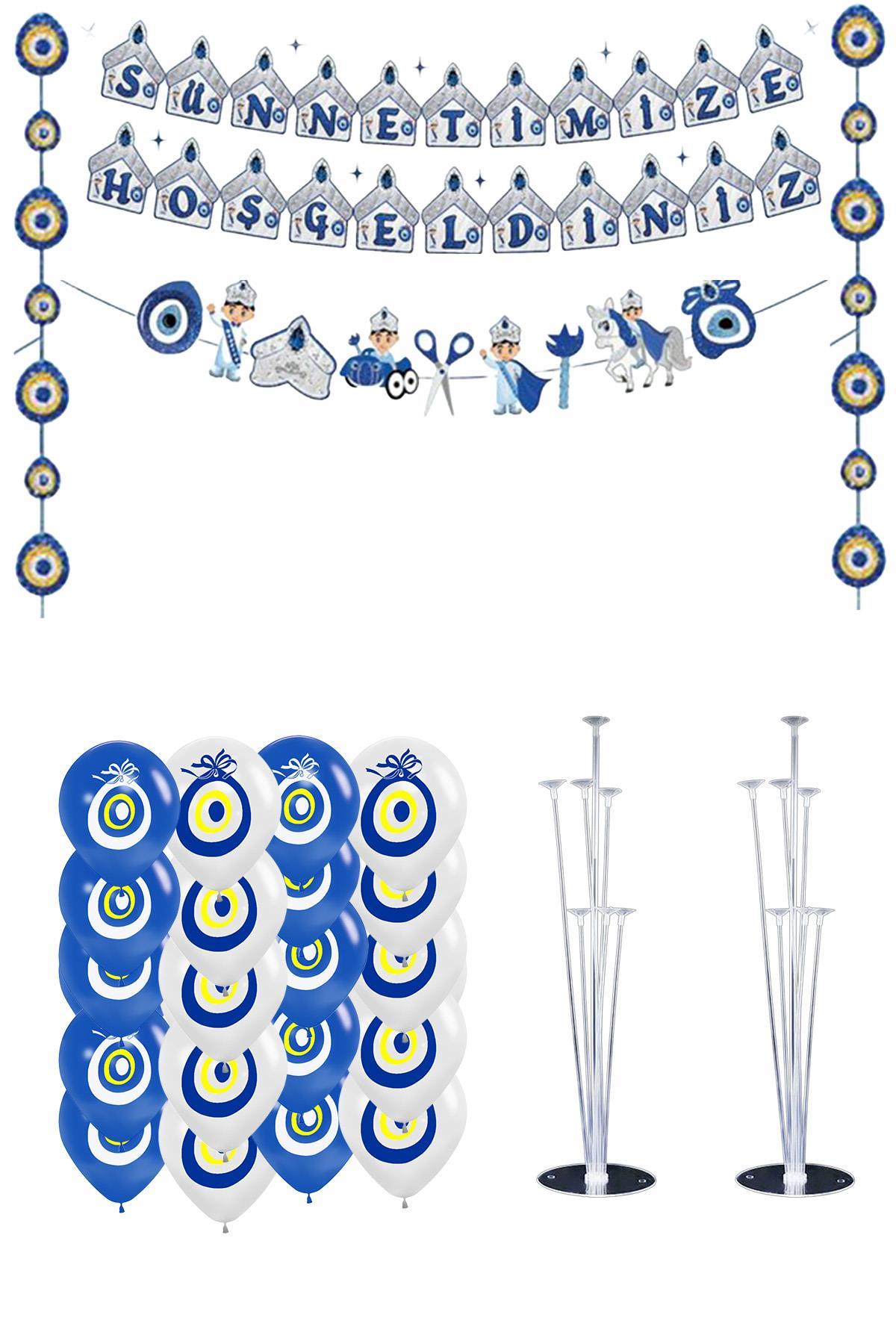 Sünnet Kutlama Seti 3Lü Banner, 20 Adet Nazar Boncuğu Baskılı Balon ve 2 Adet Balon Standı