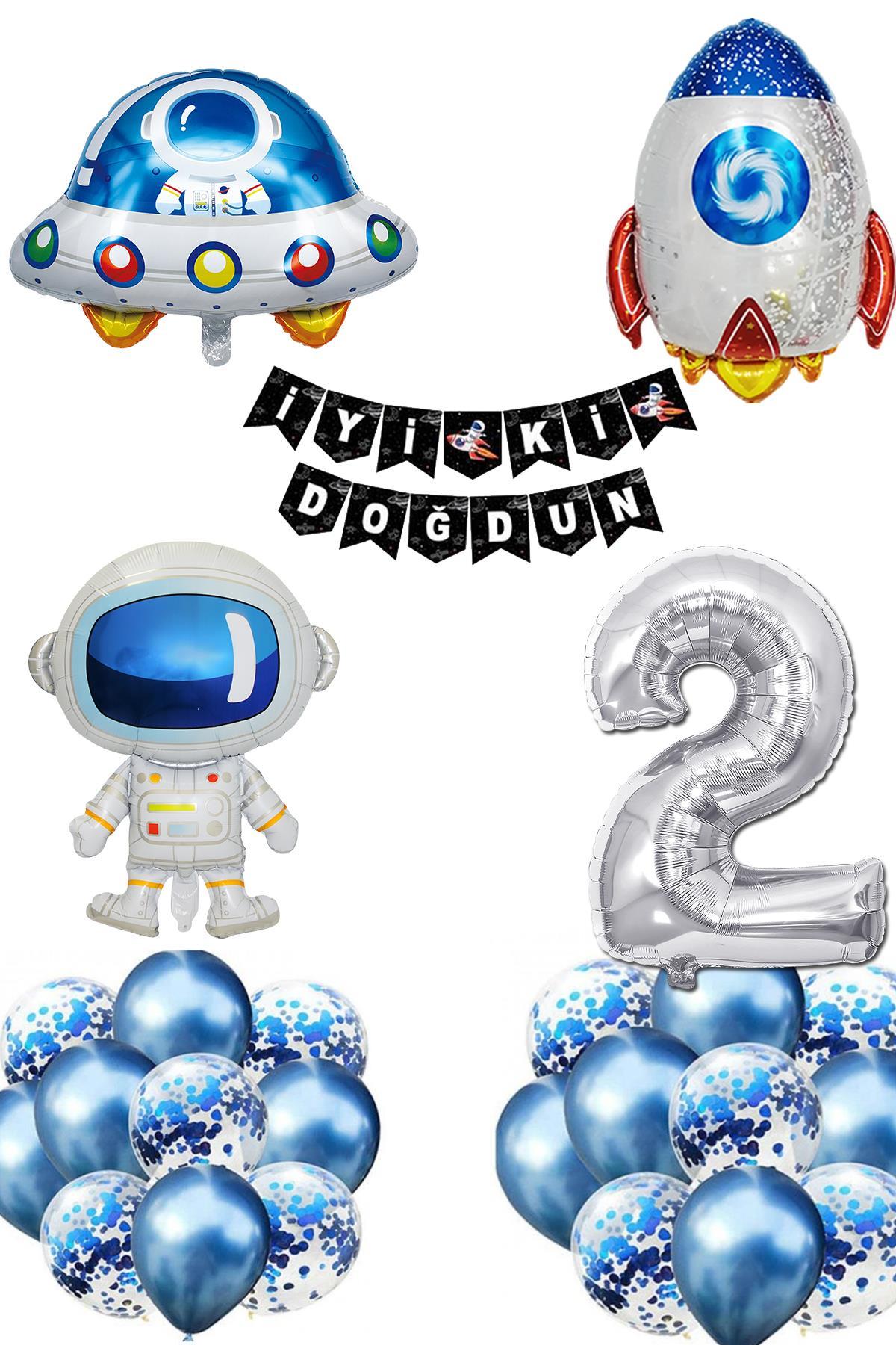 Uzay Konsepti 2 Yaş Doğum Günü Parti Kutlama Seti Astronot, Ufo Ve Uzay Gemisi Folyo Balon Set