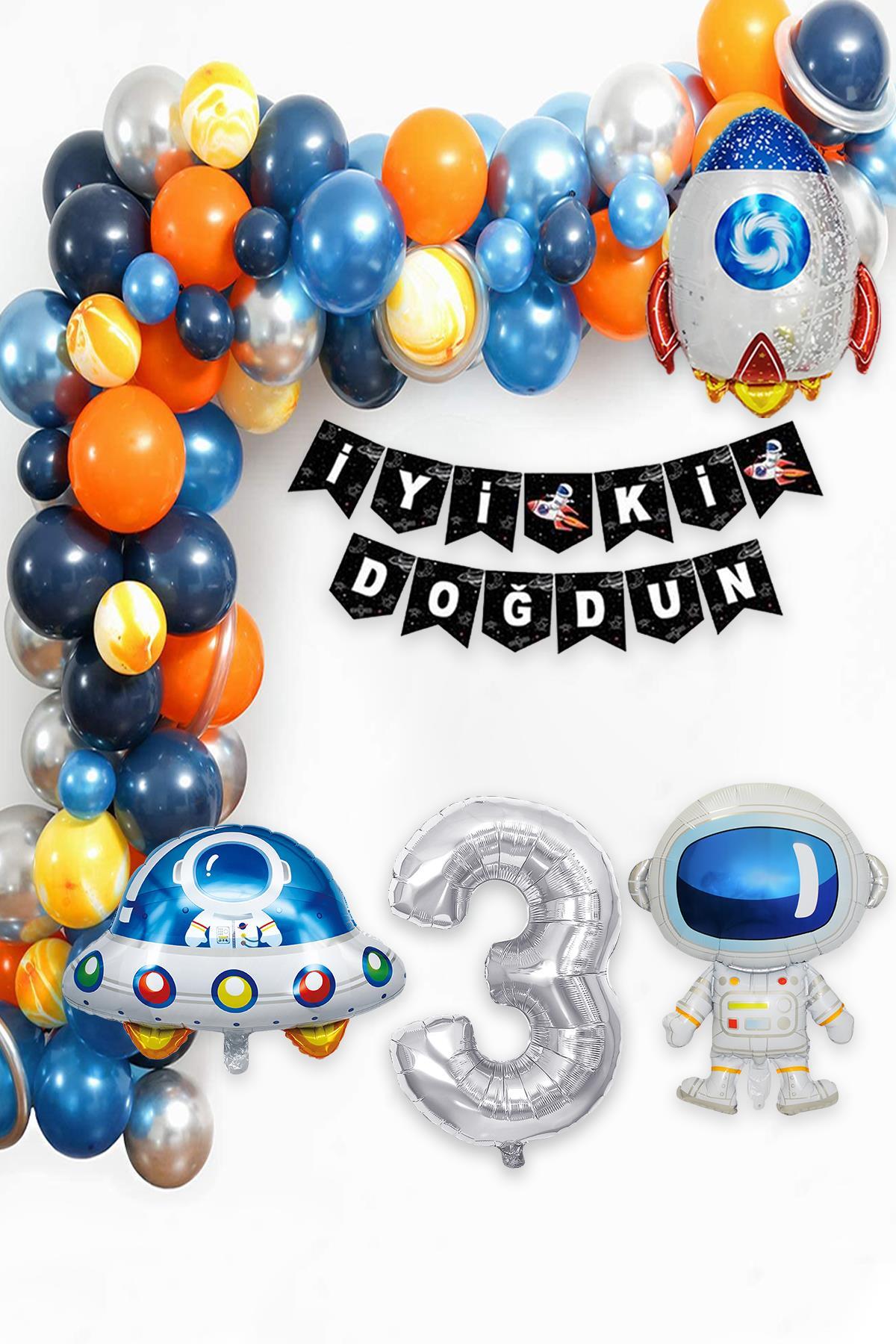 Uzay Temalı Doğum Günü Seti 3 Yaş ; 4 Adet Folyo Balon, 60 Adet Lateks Balon, Banner, Balon Zinciri ve Balon Bandı