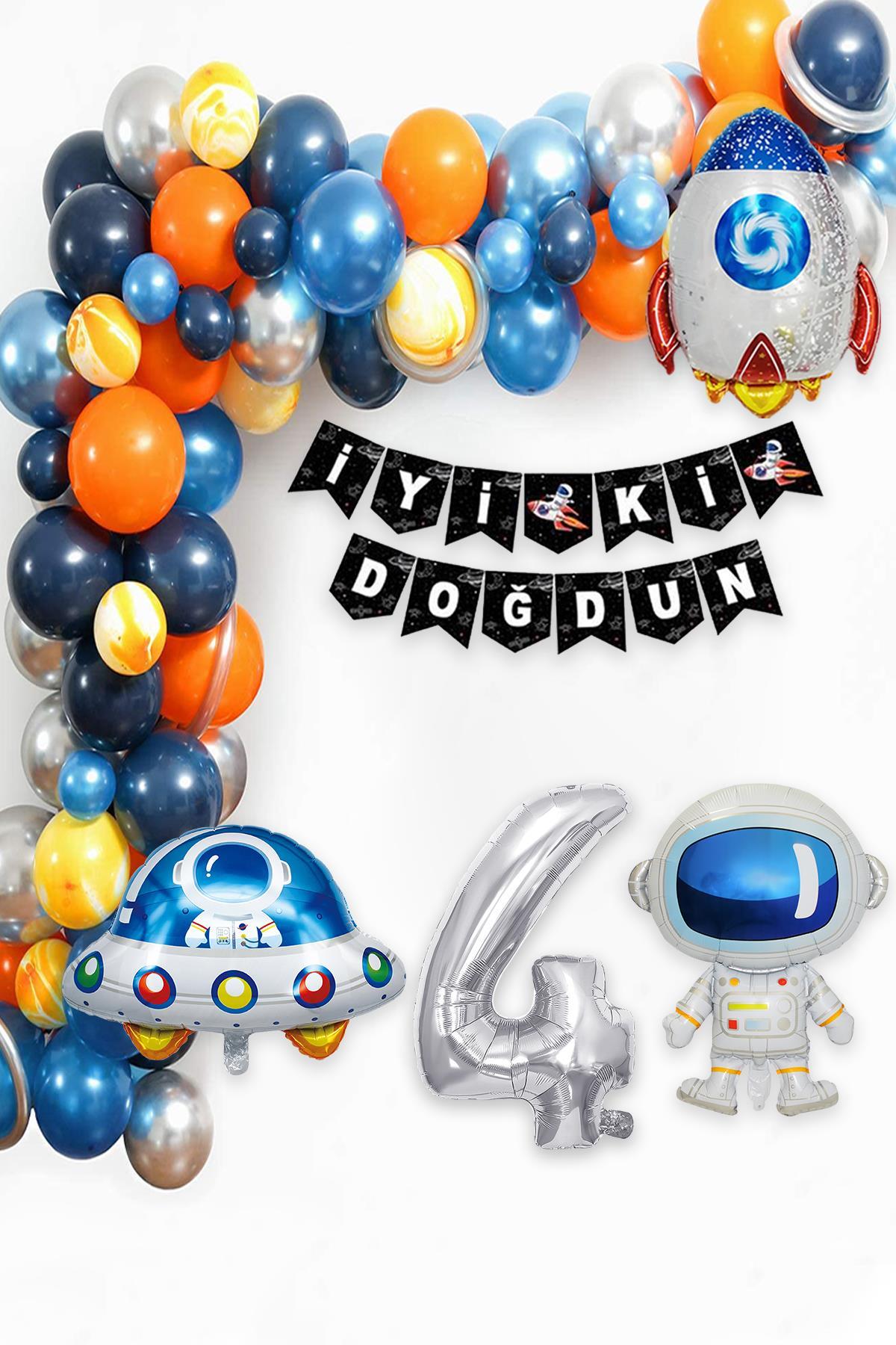 Uzay Temalı Doğum Günü Seti 4 Yaş ; 4 Adet Folyo Balon, 60 Adet Lateks Balon, Banner, Balon Zinciri ve Balon Bandı